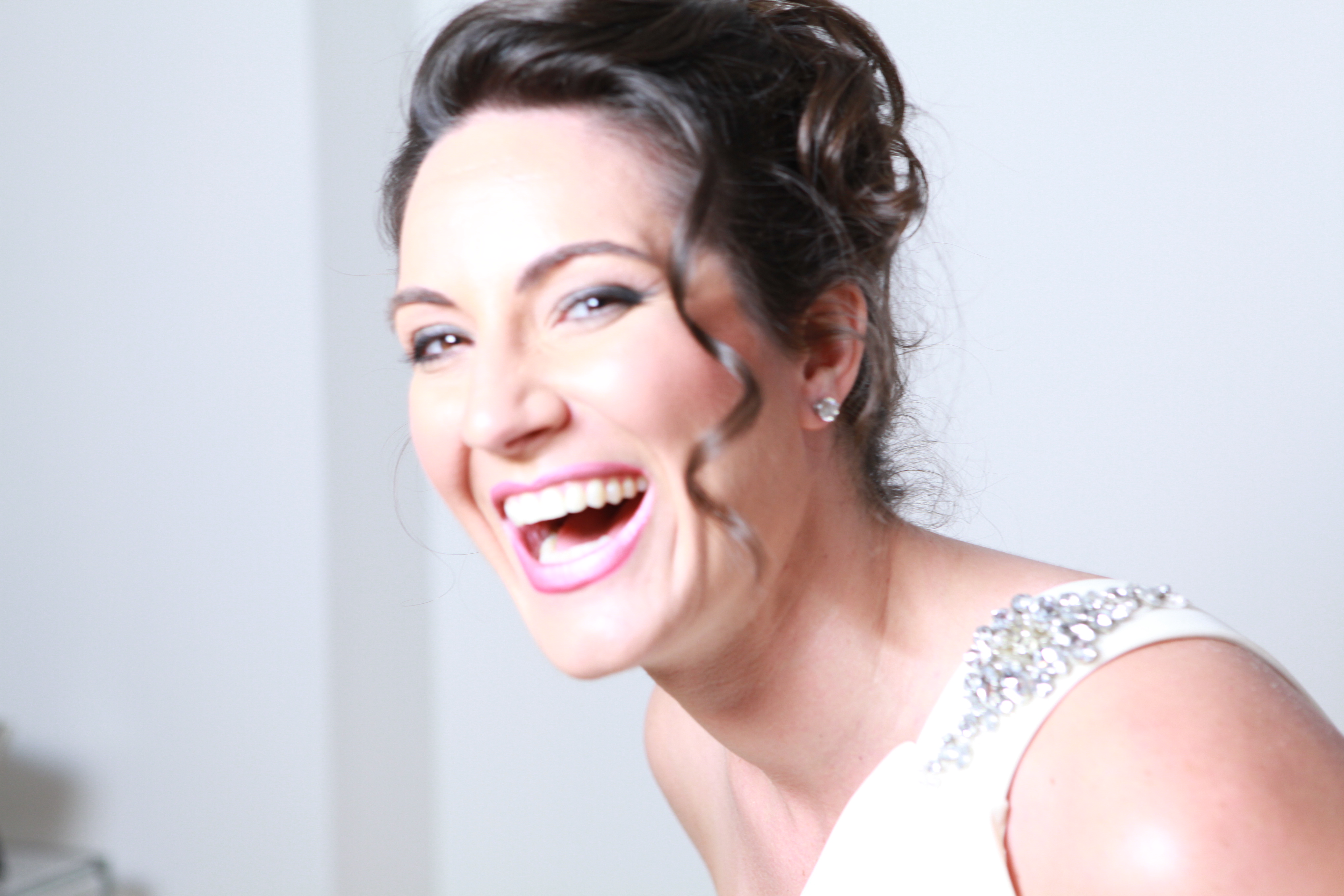 Emily laughing in a white dress